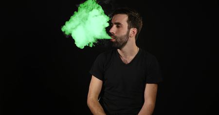 vaping man holding a mod cloud of vapor Black background isolated Selective focus