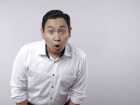 Portrait of funny young asian men in casual grey shirt, shocked gesture with open mouth. Big eyes open