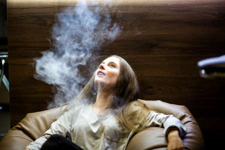 Vaping teenager. Young pretty white caucasian teenage girl with problem skin smoking an electronic cigarette indoors. Deadly bad habit. Vape activity.