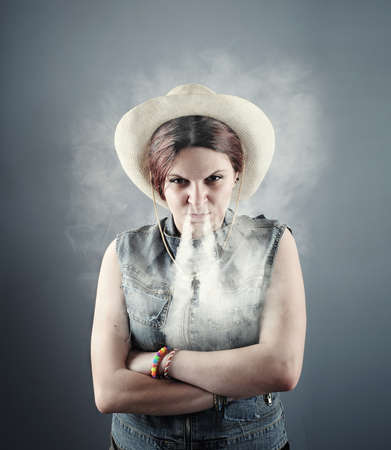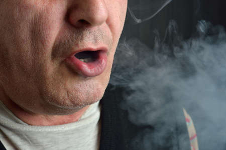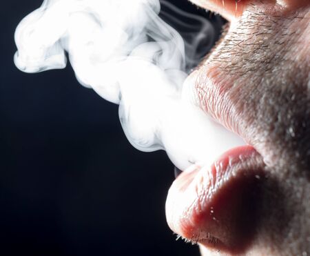 Man smokes cigarette and and releases smoke in a studio - photography of unhealthy addiction. Lifestyle and health. Lights and shadows