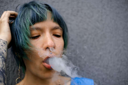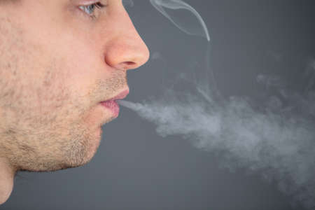 Young man exhaling thick vapor, forming a swirling cloud of smoke against a muted gray background, capturing a moment of relaxation indoors