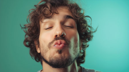 A young man exudes confidence against a turquoise backdrop, calmly engaging with the camera in the afternoon.