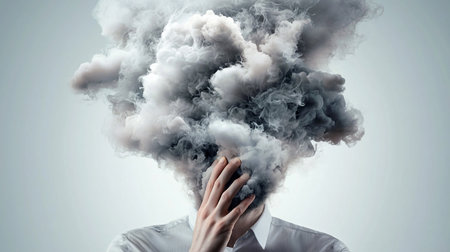 A man in a white shirt covers his face as smoke billows from his head, symbolizing stress, burnout, or mental overload against a soft, neutral background.