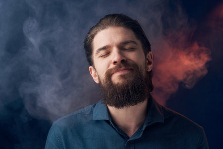 Concept. Smoke enveloped the head man. Portrait of a Bearded, stylish man with smoke. Secondhand smoke.