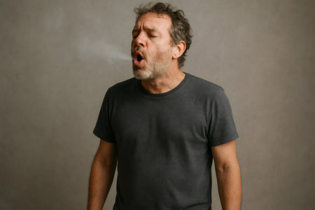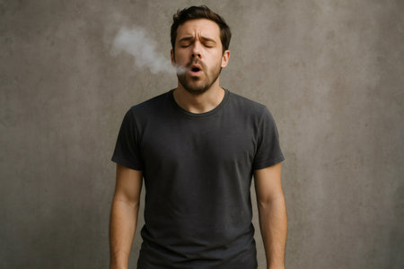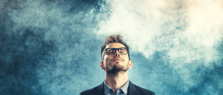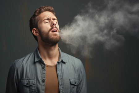 Middle aged man exhaling vapor, creating a serene misty effect against a smooth gray backdrop, embodying calmness and mindfulness