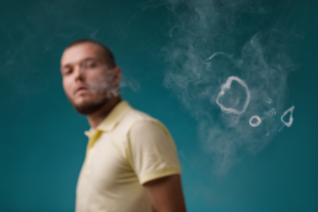 young man vaping with an electronic cigarette and make some smoke clouds.