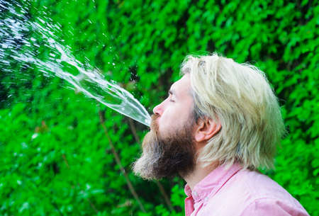 Man spits water. Healthy lifestyle. Drinking water. Hydration and drink concept.