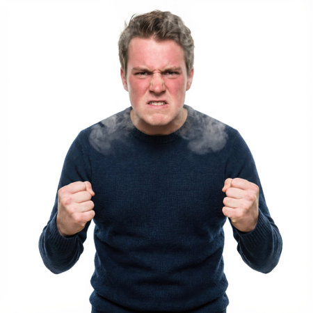 A very angry man with steam coming from his ears showing frustration and a bad temper on white background