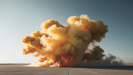 Massive explosion creating cloud of dust against clear blue sky, showcasing power and intensity