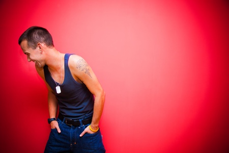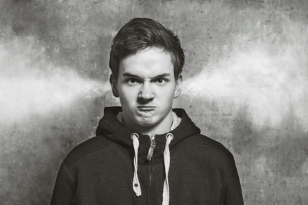 Black and white portrait of a young man with a gesture that draws attention to himself. Studio photographyof an angry young man whose steam is coming from the ears. Studio photography.