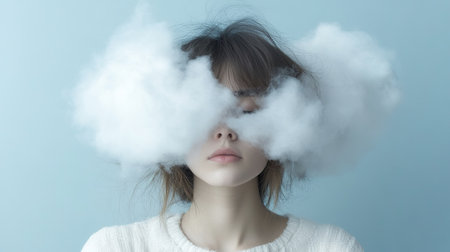 Young Woman With Head In Clouds Concept Of Anxiety, Depression, And Mental Health Challenges