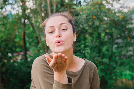 Love, peace. Young woman smiling outdoor. Beautiful brunete girl posing with kiss face expression showing love sign. Happy woman at summertime outdoor. Freedom happiness carefree happy people concept