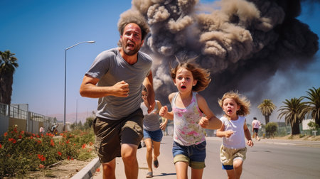 Innocent civilian running away from missile attack in the city. Kids and family escape from surprise military operation with fear and scare.