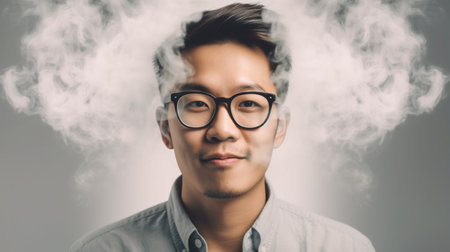 Portrait of Asian man in glasses in smoke against gray wall. Cloud of white smoke. Generative AI