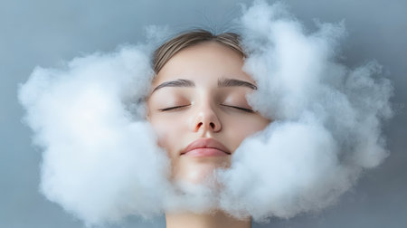 Young caucasian female with clouds covering eyes in dreamlike scene.