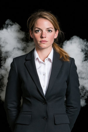 A man in a suit stands with his eyes closed inhaling deeply as smoke swirls around him in a dramatic atmosphere.