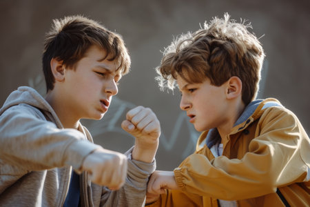 Two hands of young people making a fist bump gesture, concept of youth day solidarity and friendship for design asset.