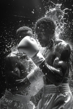 Black and white silhouettes of boxing athletes in the ring. Combat sports. Shallow depth of field, focus on the hands of athletes.