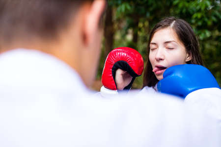 Romantic couple of boxers fighting for love on blue sky. Happy pretty girl or cute woman boxing with handsome man in gloves on sunny, summer day on nature. Sport, energy and competition