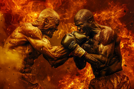Intense Fiery Boxing Match Between Two Male Athletes in Dramatic Orange Flames AI Generative