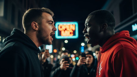 A tense confrontation brewing between two participants with intensity in their expressions and body language. Behind them the audience is slightly blurred with some members whisperin
