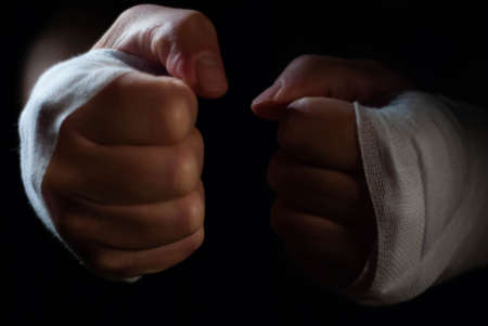 Hands of a boxer with white bandages prepared to fight in a sport battle