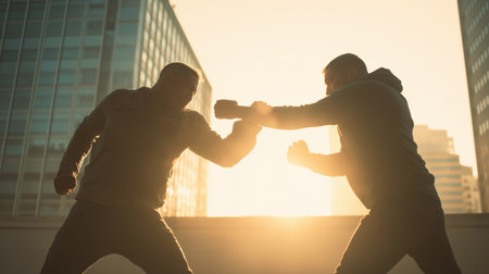 Urban street fighters sparring at sunset with sunlight streaming between skyscrapers in dramatic action scene.