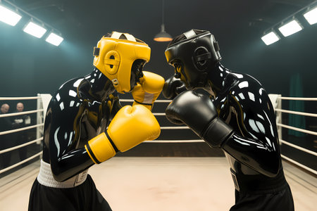 Two black and yellow boxing gloves are fighting in the ring. 3D rendering