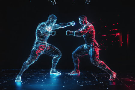 Two holographic martial artists are locked in combat, showing advanced technology at a tech exhibition.