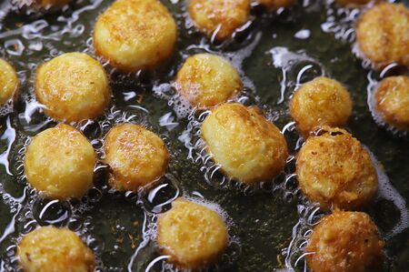 Deep fried meatballs in a kitchen pan