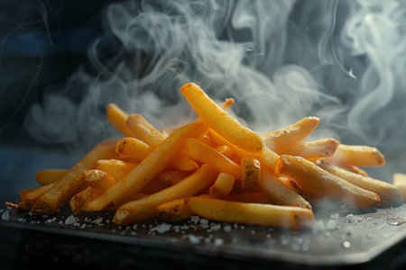 Detailed shot of golden, crispy French fries with an emphasis on their texture and mouthwatering appeal. Perfect for fast food and snack imagery.