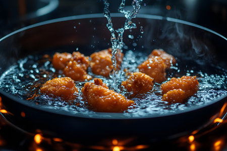 Golden brown fried chicken pieces sizzling in a pan filled with hot bubbling oil. steam rises, indicating perfect cooking conditions. highlights include the rich texture, ideal for culinary design or recipe features. Generative AI