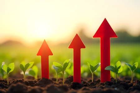 An upward growth trend illustrated by young plants emerging from stacks of coins, symbolizing investment, financial success, and sustainability.