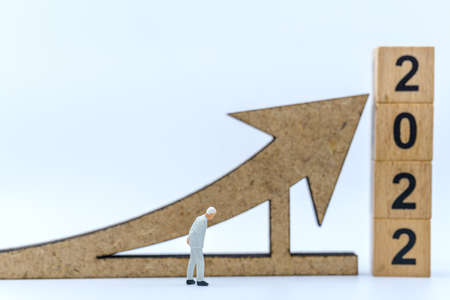 2022 New Year and Business Planning Concept. Closeup of businessman miniature figures waling with arrow sign with wooden number block on white background.