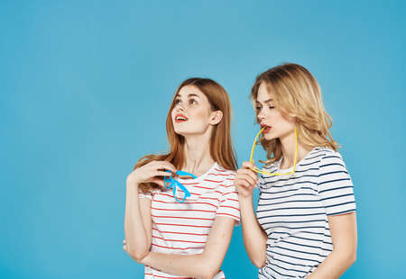 Two girlfriends striped T-shirts fashion emotions communication conflict quarrel