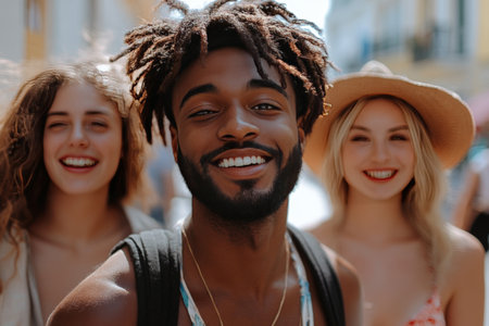 Portrait of a smiling young man with dreadlocks and friends in the background