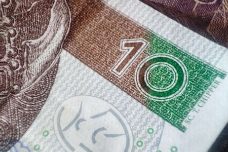 Selective focus on detail of LEI banknotes. Counting or giving Romanian LEI banknotes. World money concept, inflation and economy concept