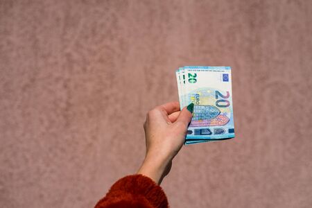 woman hands giving money like a bribe or tips. Holding EURO banknotes on a blurred background, EU currency