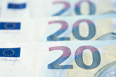 Selective focus on detail of euro banknotes. Close up macro detail of money banknotes, 20 euro isolated. World money concept, inflation and economy concept