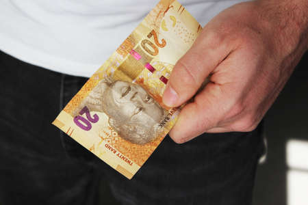 Persons hand giving the Currency of the England in the United Kingdom - One purple twenty pound and blue five pound note spread out on a brown background. Money exchange.