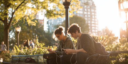 Two young people sitting on a bench in a park during golden hour with headphones on