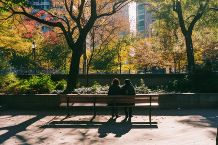A couple sits on a bench by the lake in Central Park, enjoying a peaceful moment in the shadow of tall buildings.