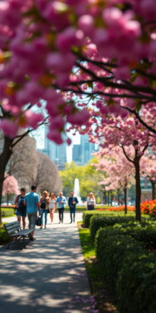 Cherry blossoms bloom along a bustling park path in spring with visitors enjoying the vibrant scenery