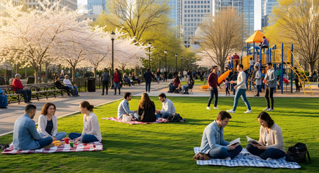 People relaxing in a vibrant city park during sunny afternoon in spring