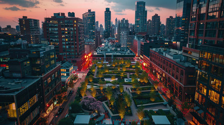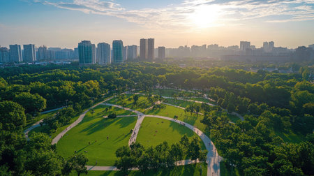 A vibrant urban park scene at sunset, featuring people biking and walking amidst greenery and city skyscrapers.