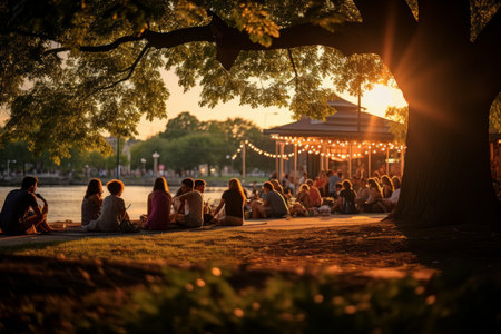 People of all ages enjoy a sunny day in the city park, engaging in picnics, games, and vibrant social gatherings, creating a lively outdoor atmosphere.