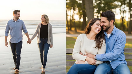 collage of smiling couple holding hands while sitting on bench in park