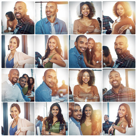 A collage presents multiple individuals of diverse backgrounds. They are smiling and laughing. The portraits use soft lighting. The composition features a variety of skin tones and ages. This image may be suitable for use in advertising, editorial content, or promotional materials that celebrate inclusivity.