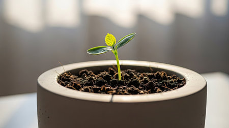 A close-up captures a small plant with vibrant green leaves emerging from dark soil inside a circular concrete pot. The composition emphasizes the plant against a soft, blurred background, with natural light illuminating the scene. Suitable for illustrating growth, ecology, or environmental concepts, and for a variety of commercial uses.
