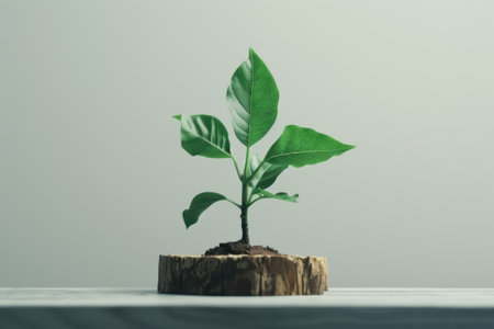 Young plant growing on wooden surface in minimalist setting with fresh green leaves.